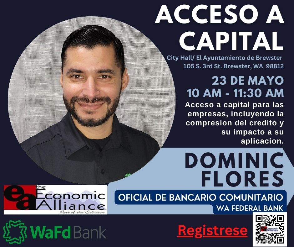 Acompáñenos el 23 de Mayo en el ayuntamiento de Brewster a las 10:00 AM-11:30AM para un taller sobre Acceso al Capital con Dominic Flores, Oficial del Banco comunitario de Washington Federal Bank. Hablaremos de los fondos disponibles para las pequeñas empresas, del acceso a capital, comprendiendo el crédito y cómo afecta en su solicitud ¡Esperamos que nos puedan acompañar y no olvide registrarse! https://www.eventbrite.sg/e/626272165907