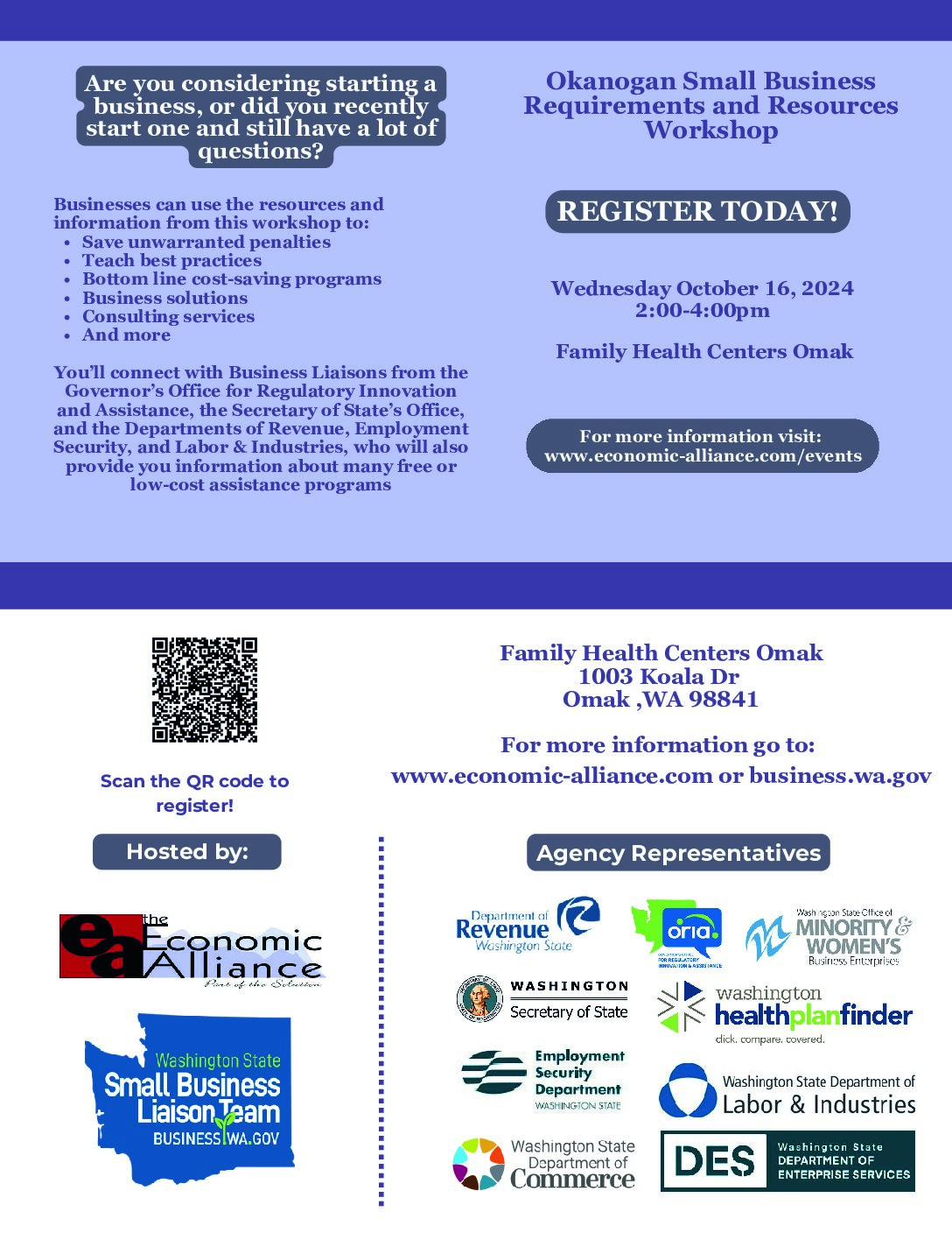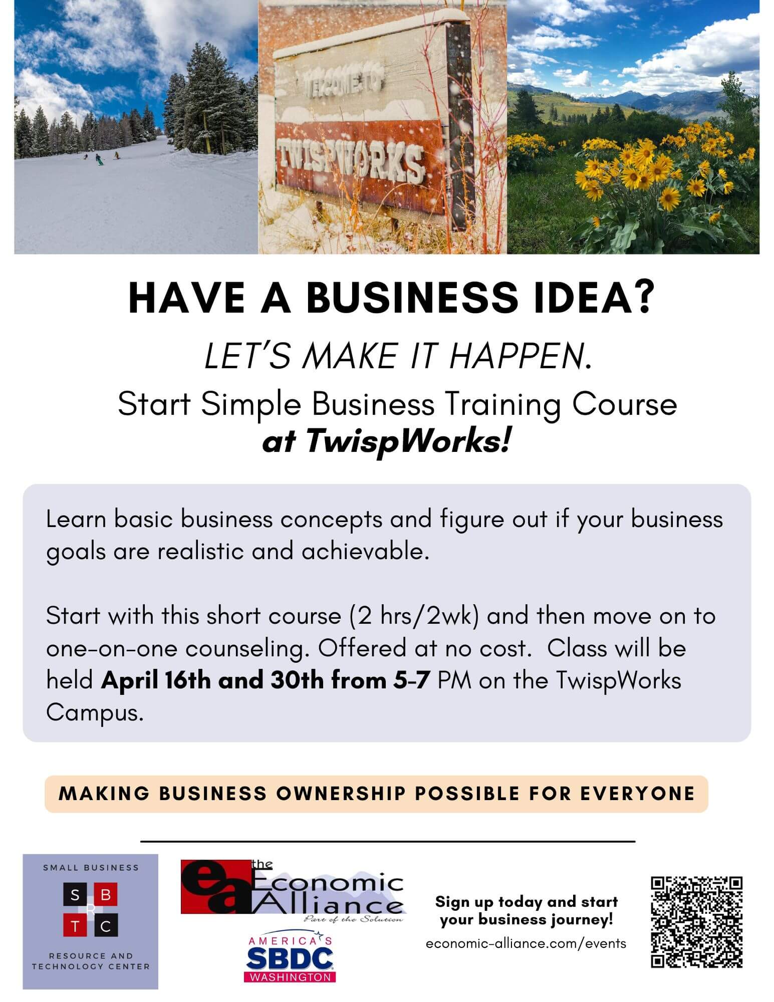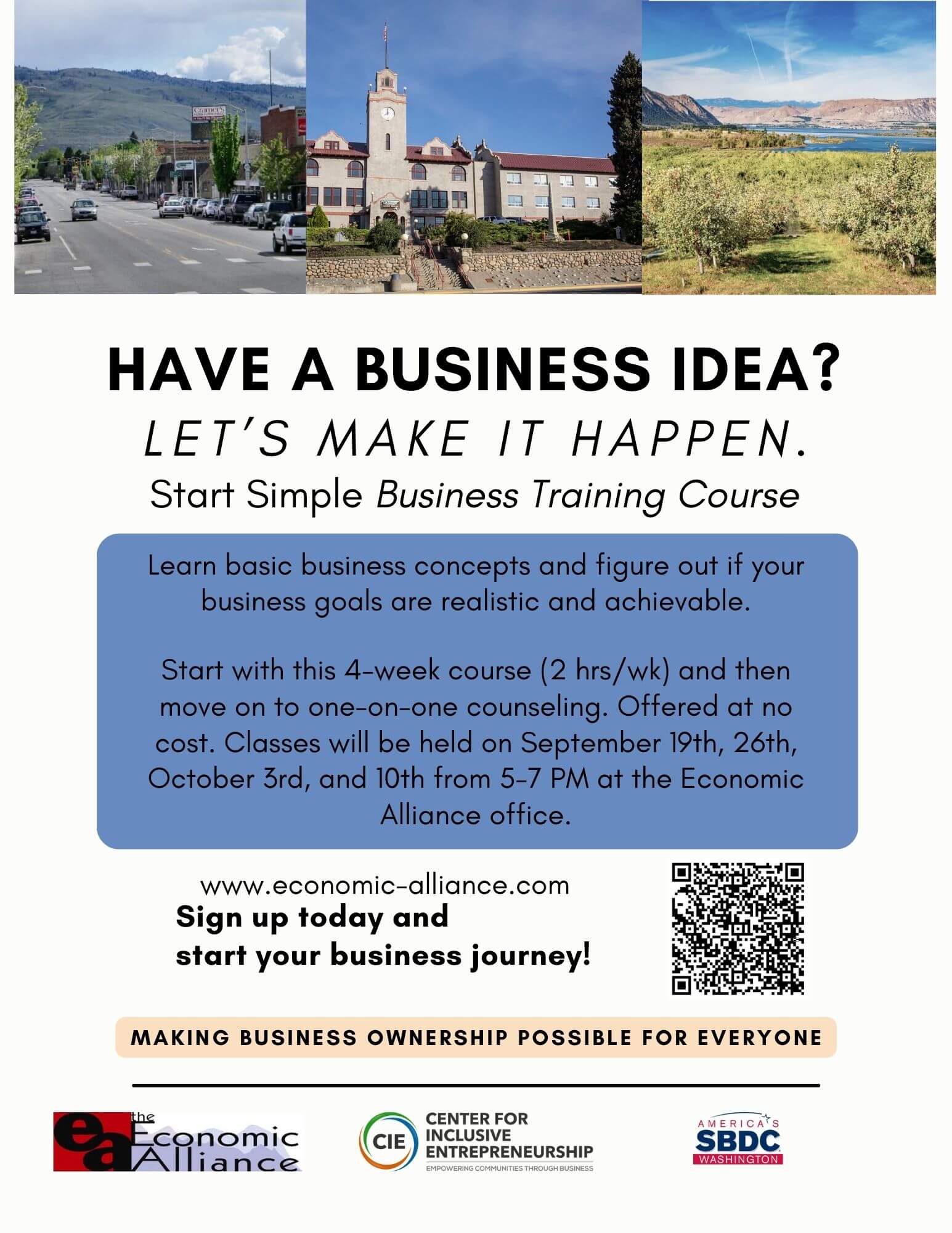EA Office 238 E Oak, Okanogan, WAHave a Business Idea? Let’s make it happen! Learn basic business concepts and figure out if your business goals are realistic and achievable. Join us on September 19th, 26th, October...