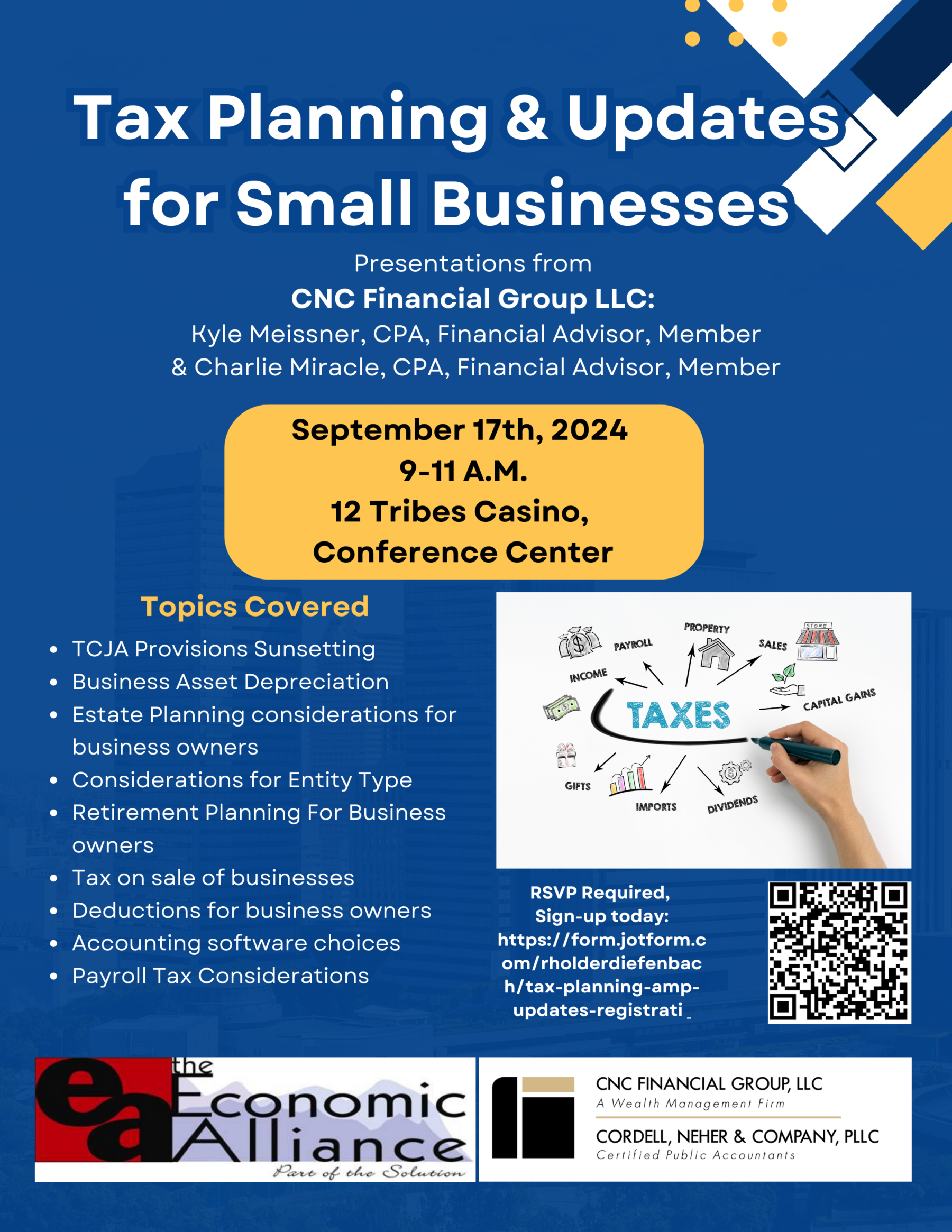 Presentations from CNC Financial Group LLC: Kyle Meissner, CPA, Financial Advisor Member & Charlie Miracle, CPA, Financial Advisor, Member Topics Covered: TCJA Provisions Sunsetting Business Asset Depreciation Estate Planning considerations...